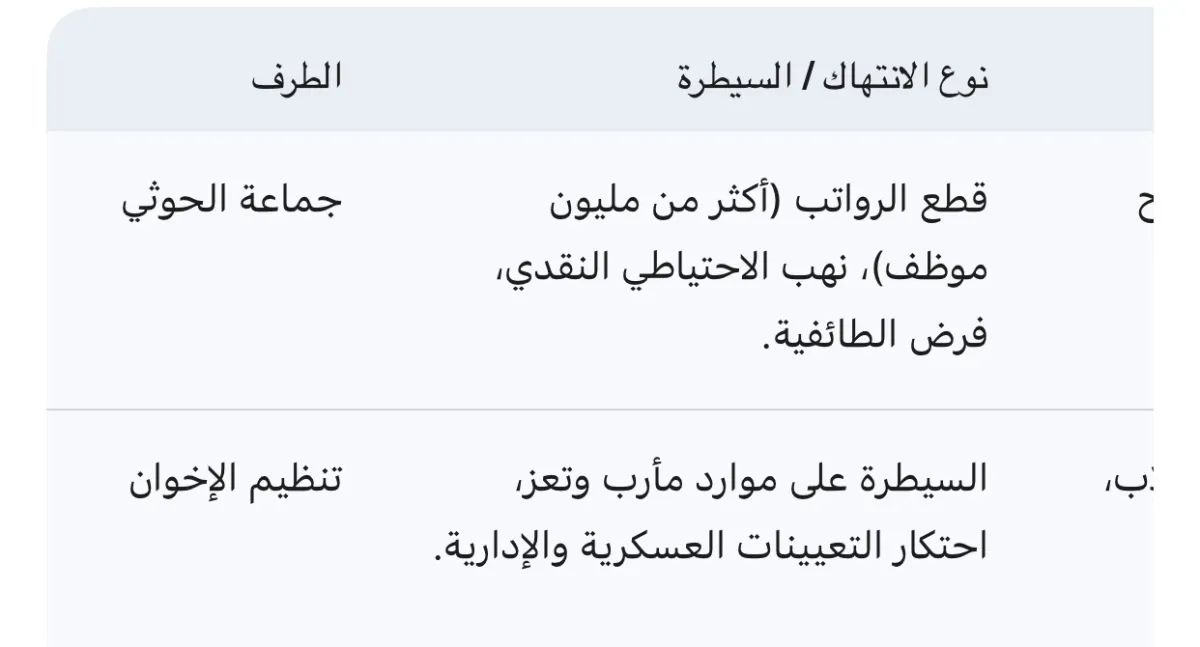 خلص التقرير إلى أن السياسة المشتركة للطرفين اعتمدت على "اقتصاد الحرب". فمن خلال فرض الإتاوات والجبايات القسرية على التجار والمواطنين، نجح التحالف "الحوثي - الإخواني" في بناء إمبراطوريات مالية خاصة على أنقاض جوع الشعب. هذه المصالح المالية المشتركة أصبحت هي المحرك الرئيس لإطالة أمد الصراع، حيث يرى الطرفان في انتهاء الحرب نهايةً لنفوذهما ومكاسبهما غير المشروعة.