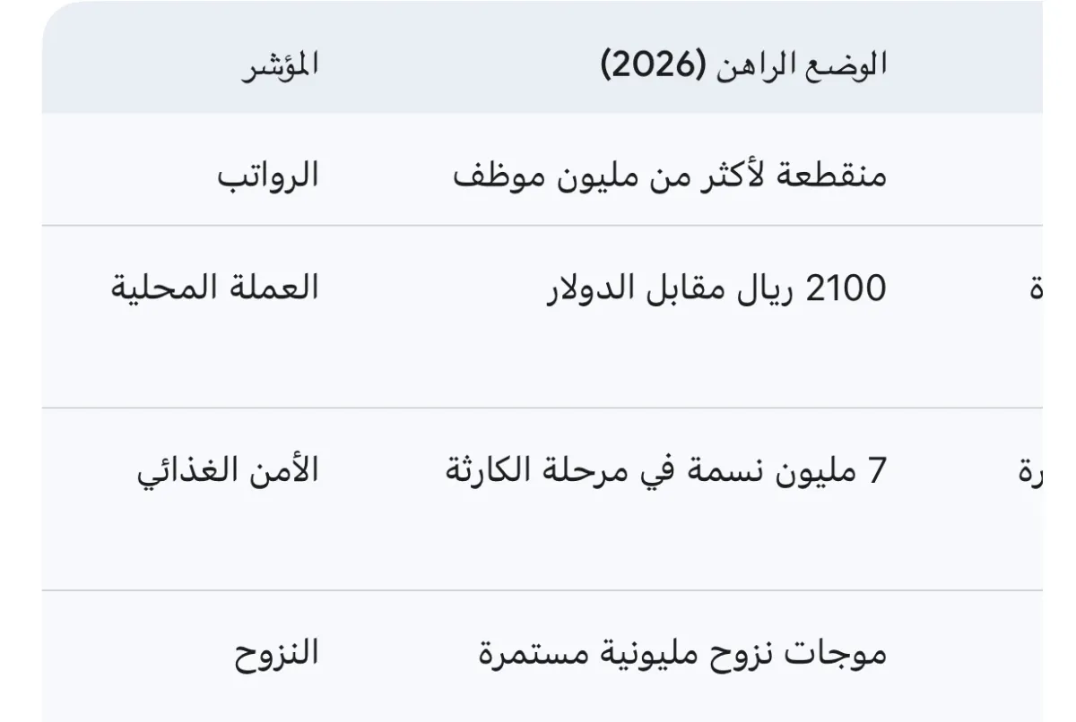 • تجميد الجبهات والانهيار الاقتصادي: ساهم تجميد الجبهات الاستراتيجية في منح الحوثيين فرصة للتوسع، مما أضعف العملة المحلية التي تجاوزت حاجز 2100 ريال مقابل الدولار مطلع 2026.